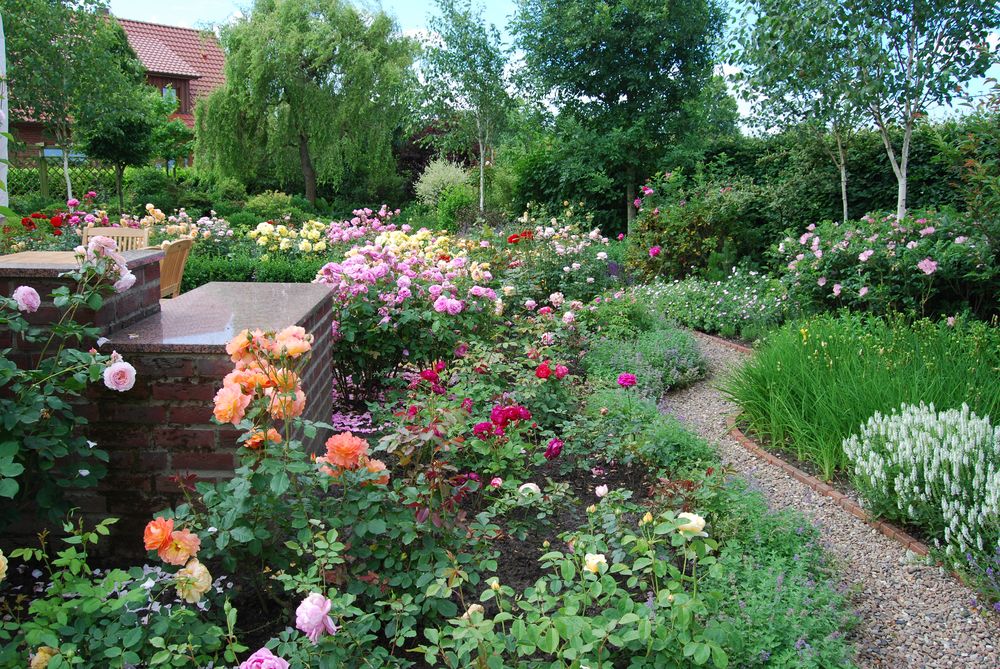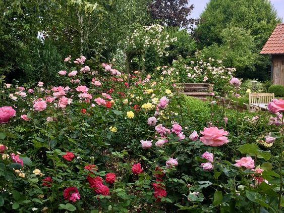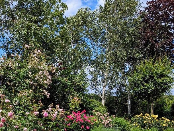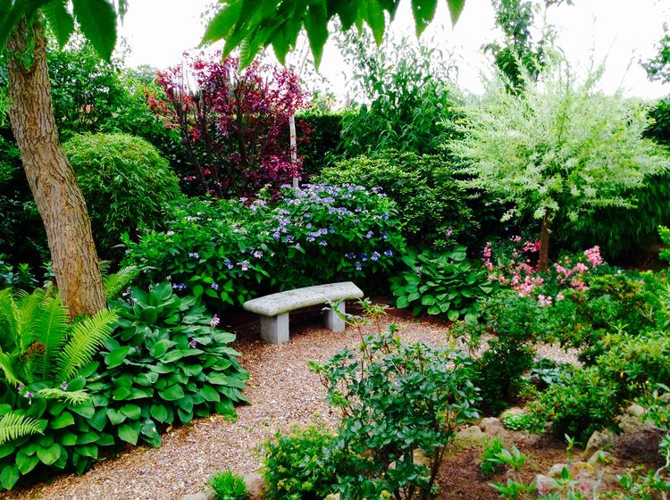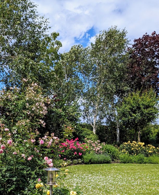 Angelegt als Erinnerung an ihre englische Heimat ist dieser Garten eine gut durchdachte Mischung: romantisch, intim aber nicht übertrieben formell. Ein gewundener Kiesweg vereint die Vielfalt der Rosen, das Lichtspiel der Himalaya-Birken, die filigranen Bewegungen des Bambus sowie die strukturbringende ‚Rockery‘ (Felsenbeet) mit kleinem Wasserfall. Eine grüne Oase voller Ruhe und Ästhetik.