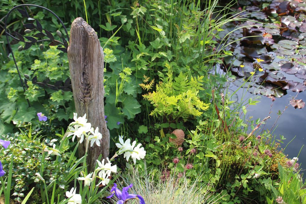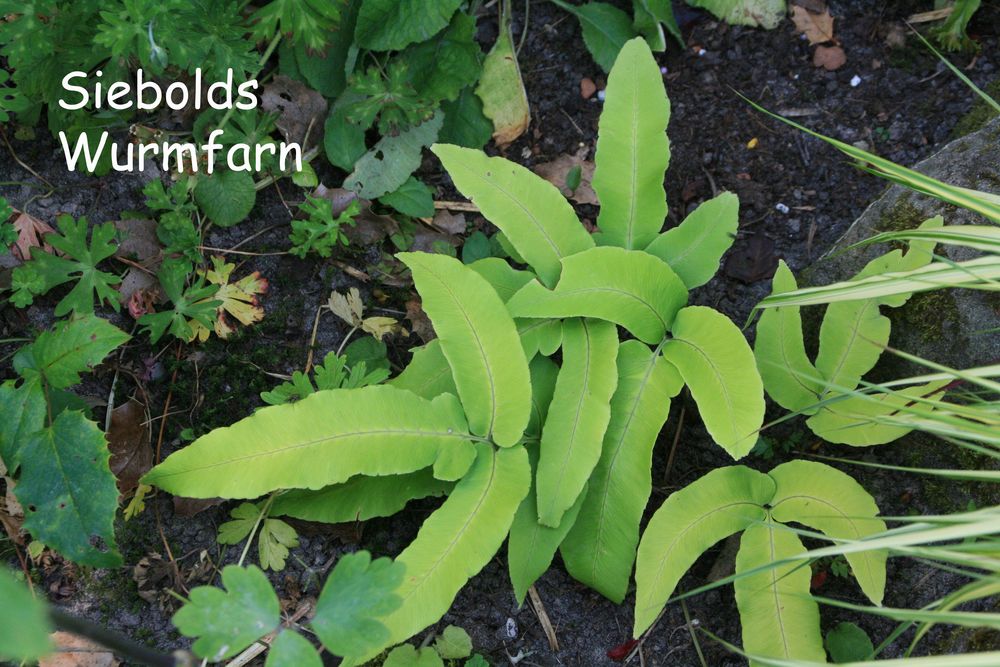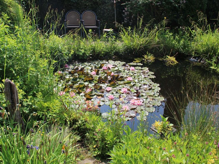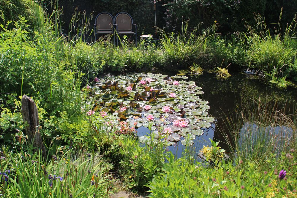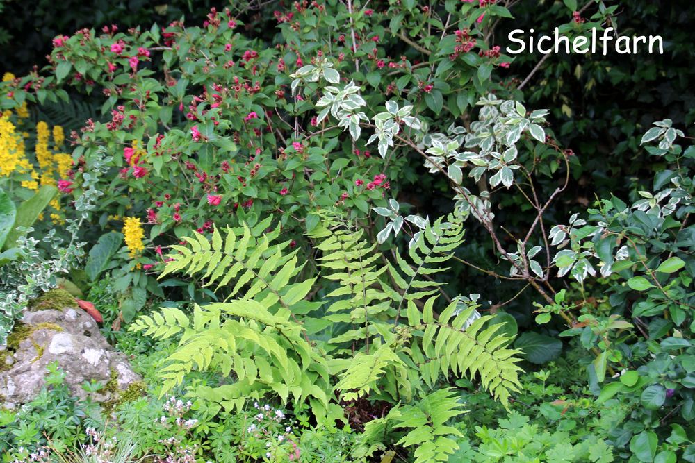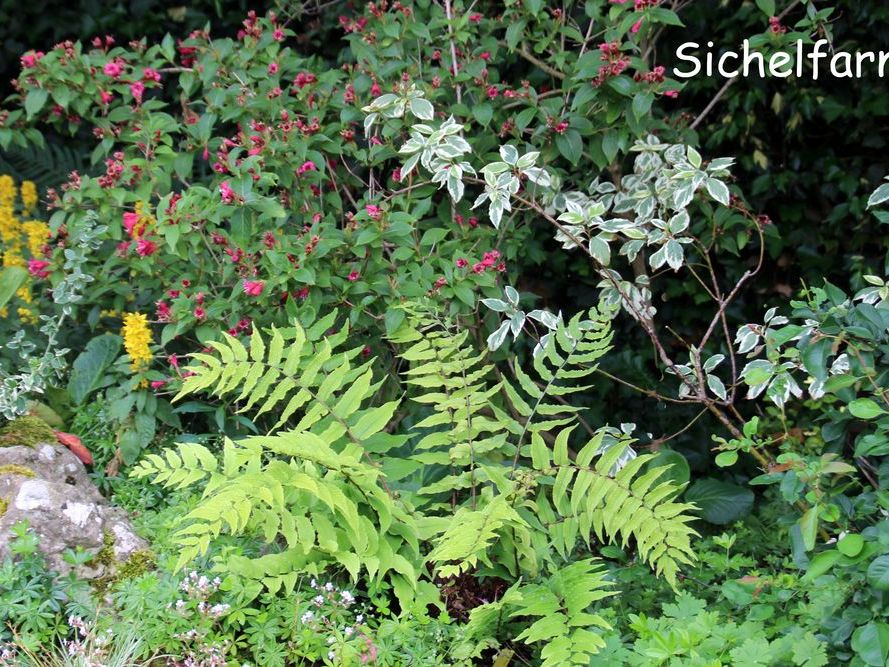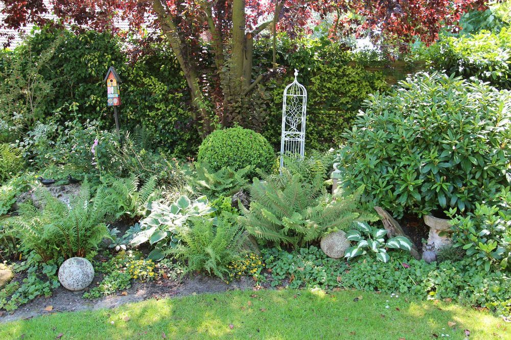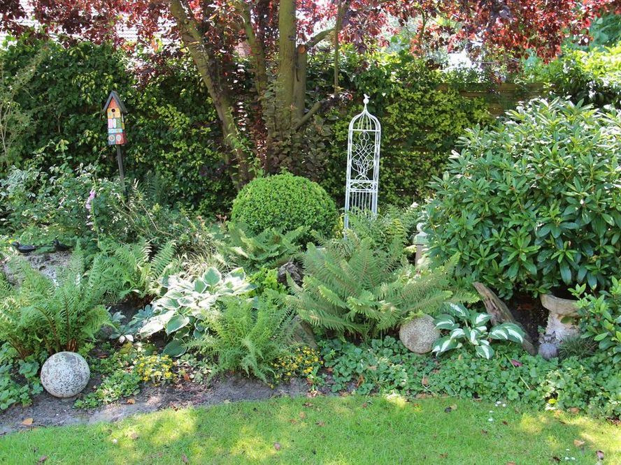 In unserem naturnah angelegten Garten (500 m²) können Sie über 50 Farne kennenlernen, die meisten sind auch im Winter grün (diverse Farninfos gratis). Im Seerosenteich leben grüne Teichfrösche, auf der Terrasse haben sich niedrige Fetthennensorten in hübschen Gefäßen versammelt.
