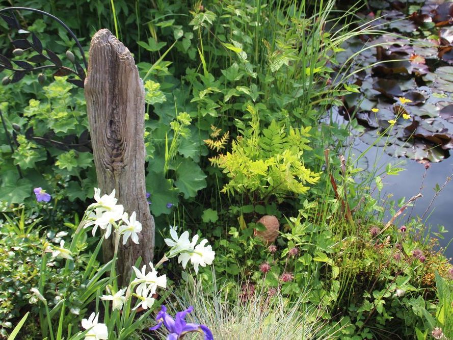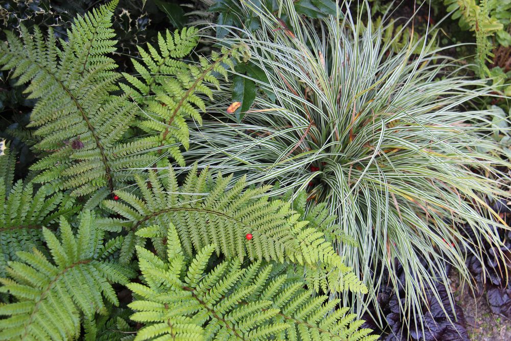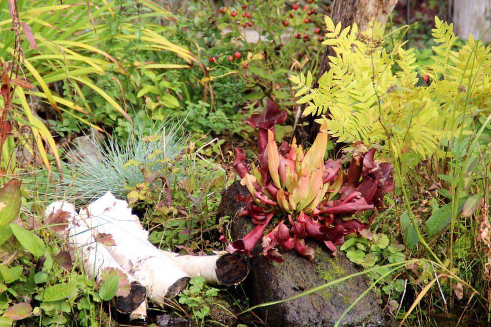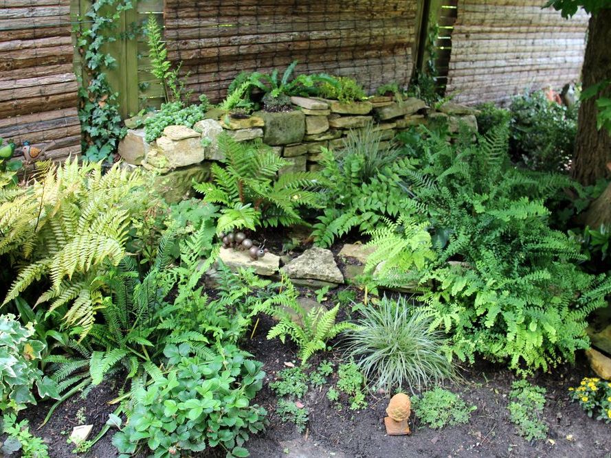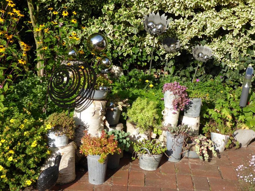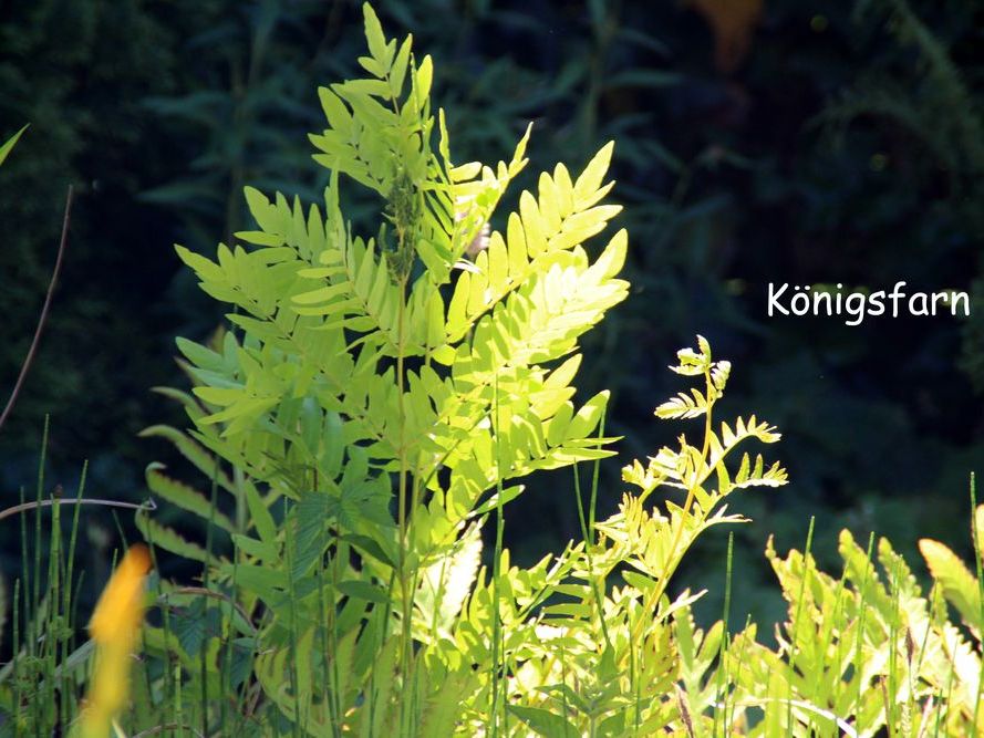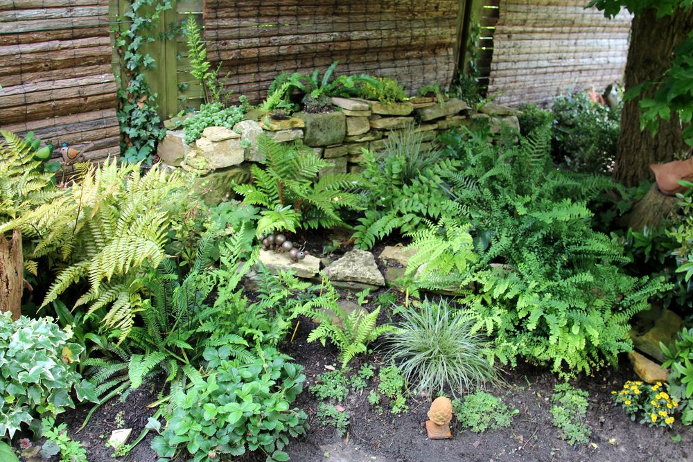 In unserem naturnah angelegten Garten (500 m²) können Sie über 50 Farne kennenlernen, die meisten sind auch im Winter grün (diverse Farninfos gratis). Im Seerosenteich leben grüne Teichfrösche, auf der Terrasse haben sich niedrige Fetthennensorten in hübschen Gefäßen versammelt.