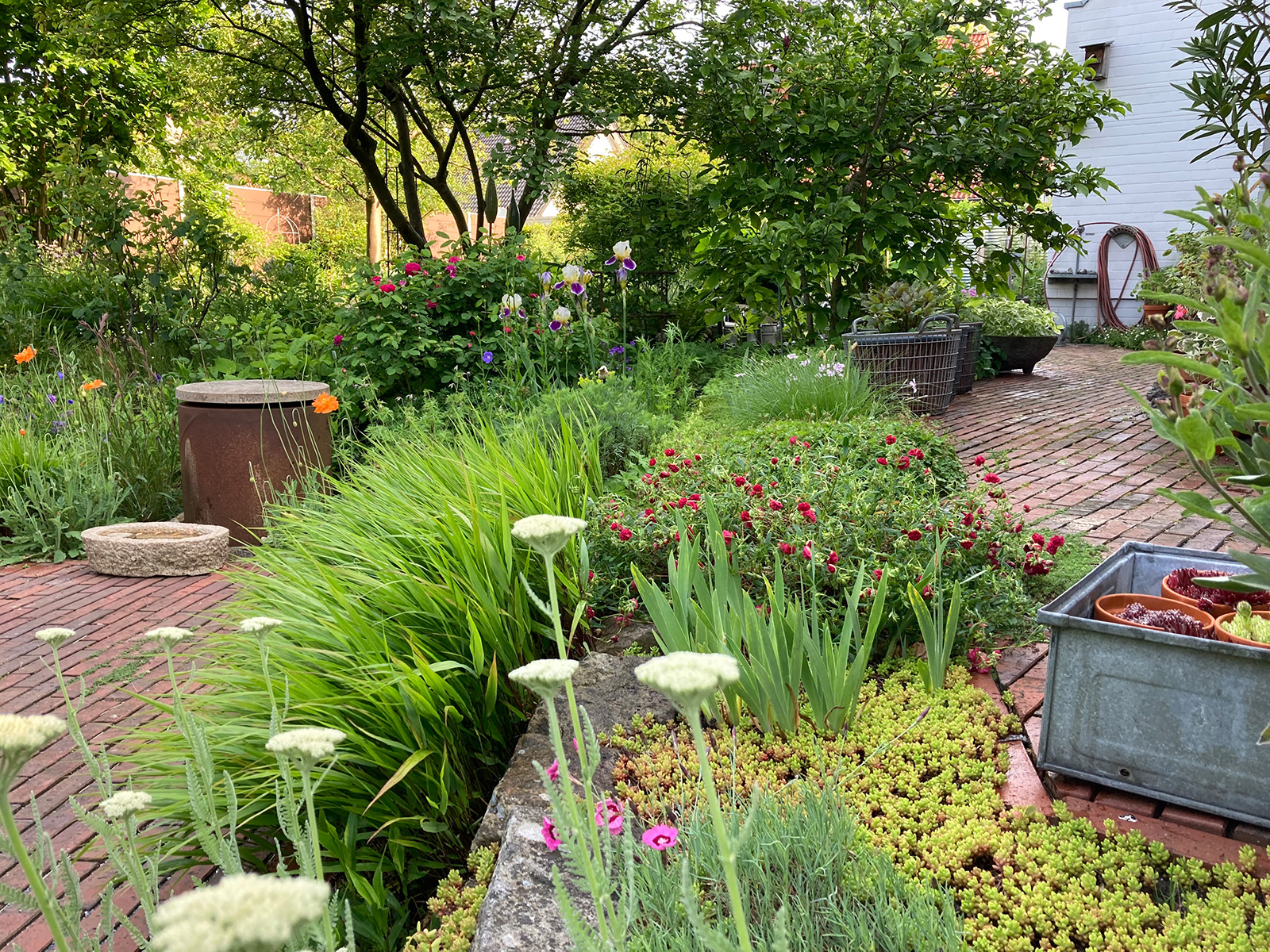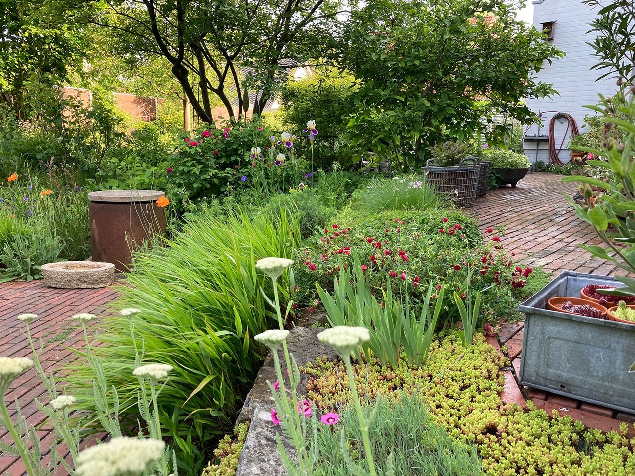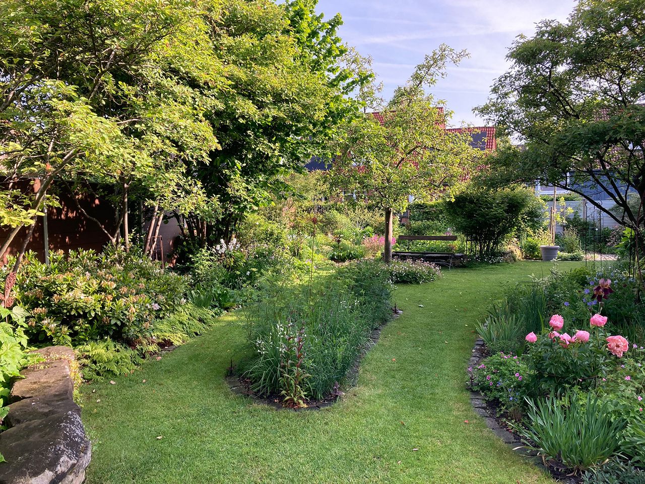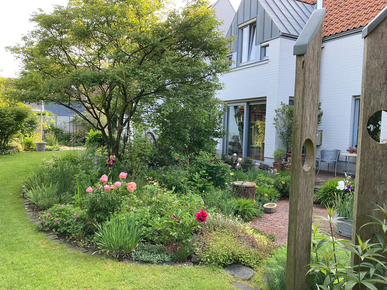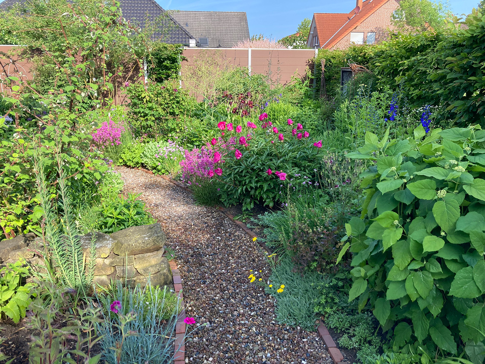 "Es wird durchgeblüht." Ganz im Sinne Karl Foersters blüht es zu allen Jahreszeiten in unserem Garten (800 qm). Es gibt Sonnen-, Schattenbeete und Topfarrangements, in denen die Leidenschaft für besondere Stauden und Gräser kreativ umgesetzt wird. Trockenmauern, Rosen und Gehölze geben dem Garten Struktur. Zentraler Punkt ist der Senkgarten. Es gibt verschiedene Sitzgelegenheiten, von denen der Garten immer wieder in einem anderen Blickwinkel betrachtet werden kann.