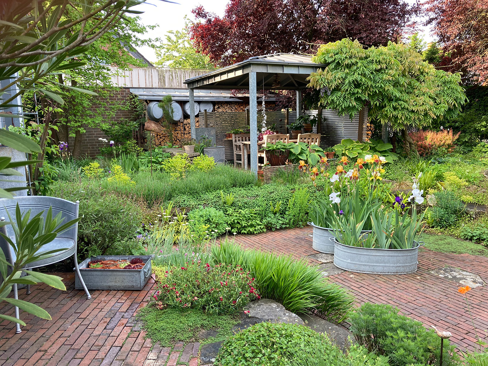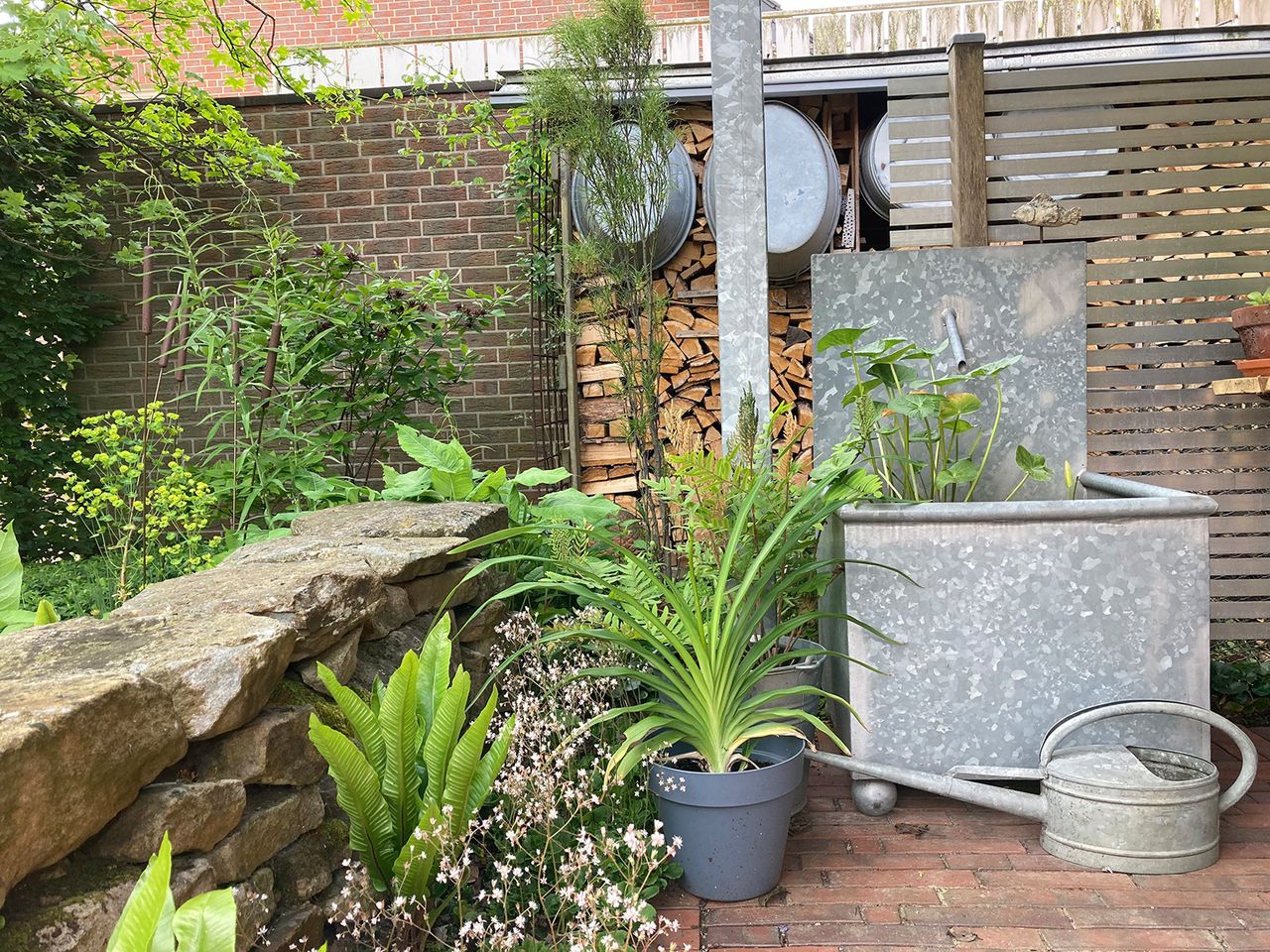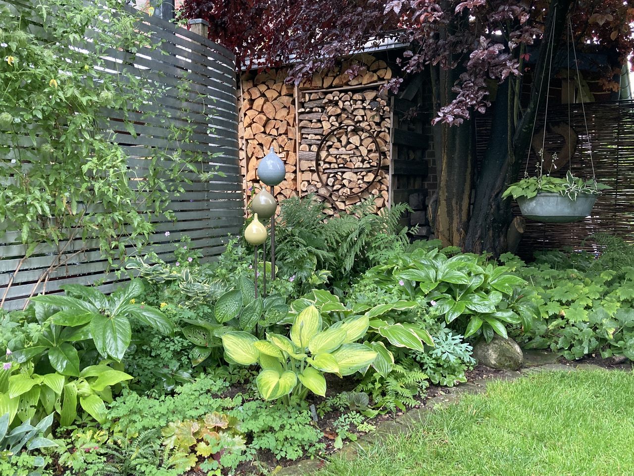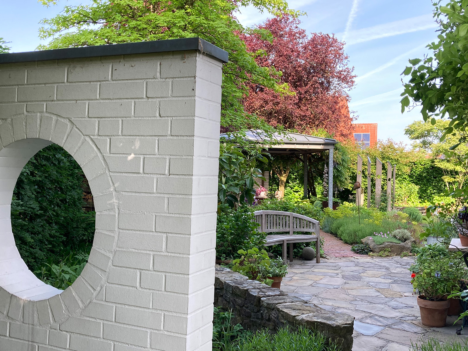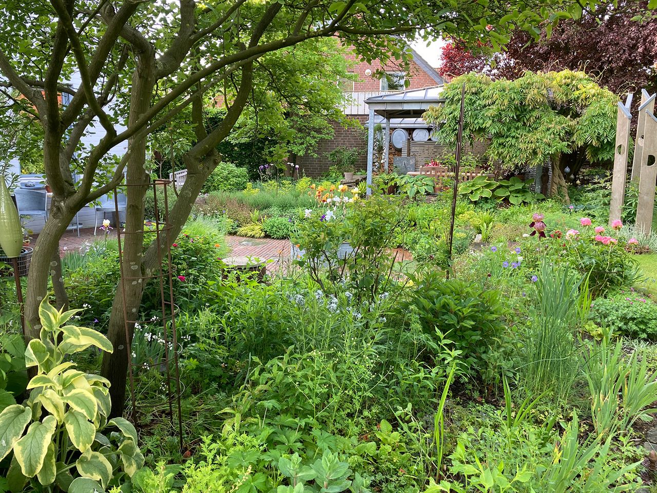 "Es wird durchgeblüht." Ganz im Sinne Karl Foersters blüht es zu allen Jahreszeiten in unserem Garten (800 qm). Es gibt Sonnen-, Schattenbeete und Topfarrangements, in denen die Leidenschaft für besondere Stauden und Gräser kreativ umgesetzt wird. Trockenmauern, Rosen und Gehölze geben dem Garten Struktur. Zentraler Punkt ist der Senkgarten. Es gibt verschiedene Sitzgelegenheiten, von denen der Garten immer wieder in einem anderen Blickwinkel betrachtet werden kann.