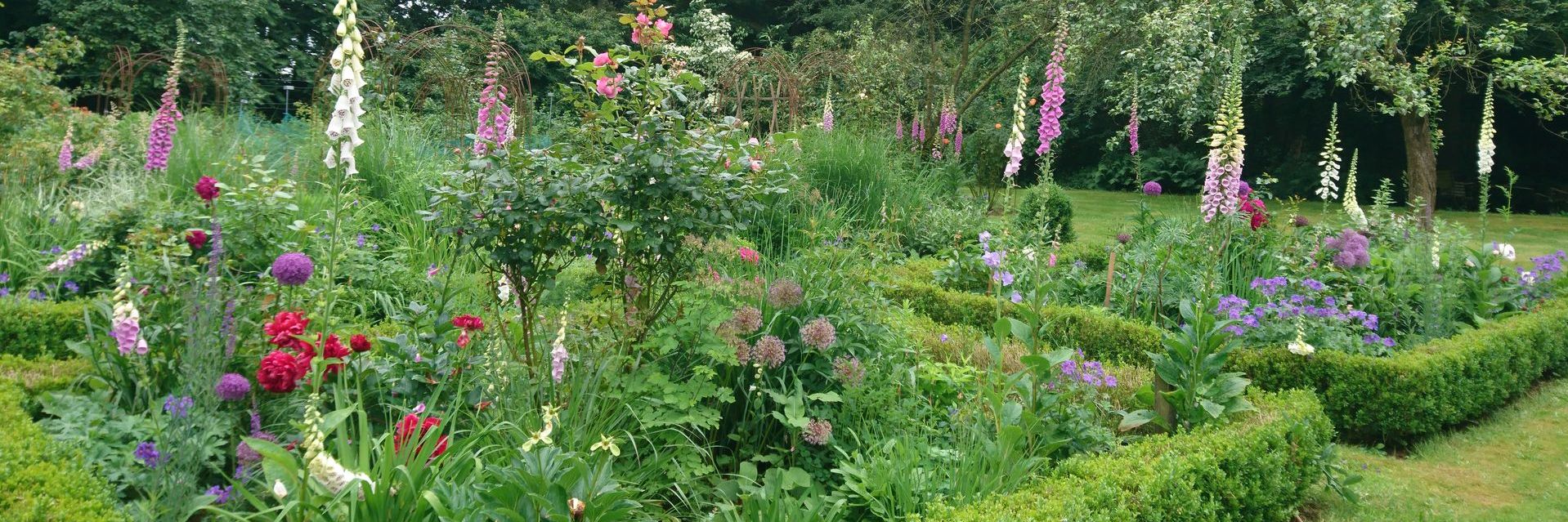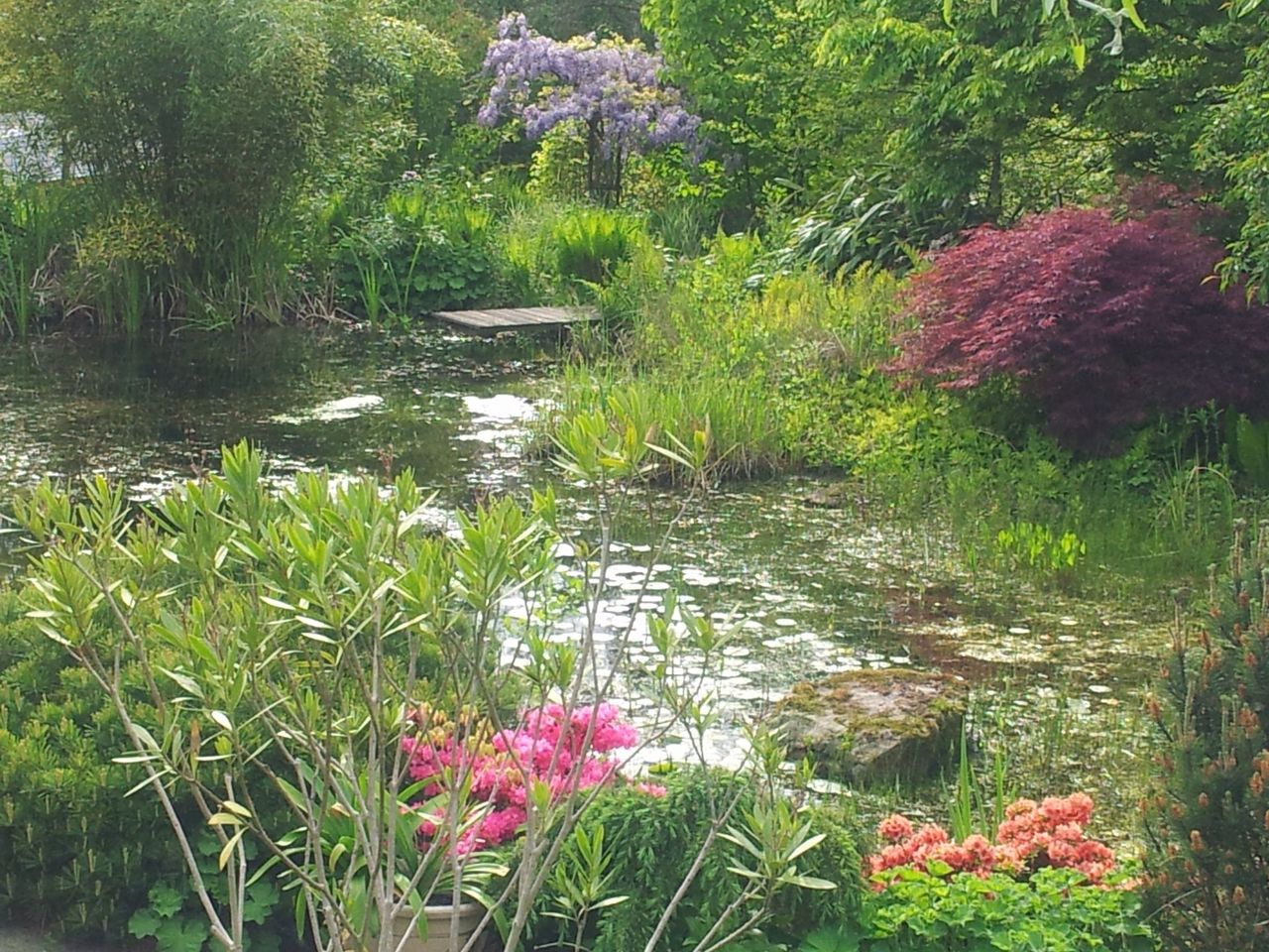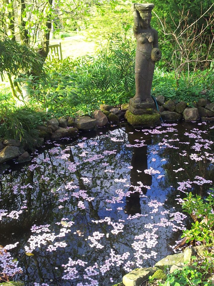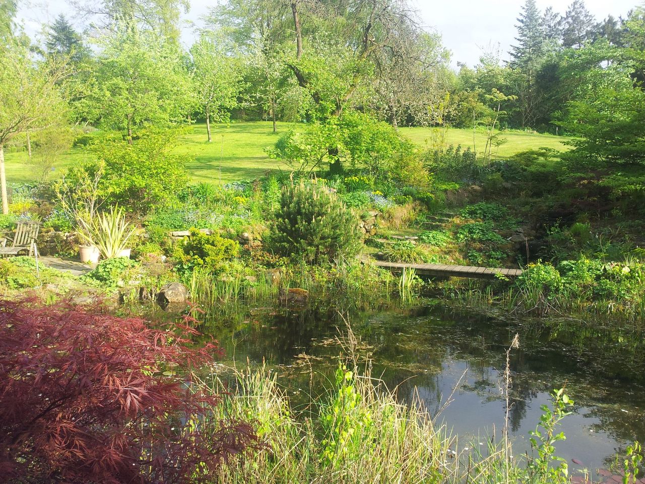 Großer naturnaher Hanggarten mit altem Baumbestand, vielen Stauden und Gehölzen, Teichanlage, Obstwiese und Nutzgarten.