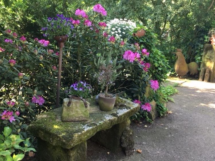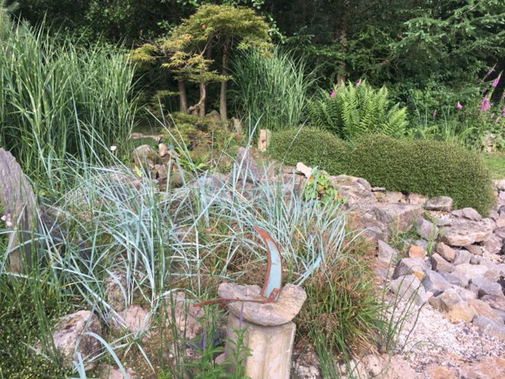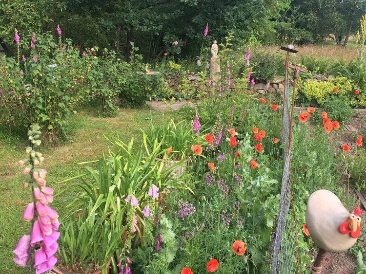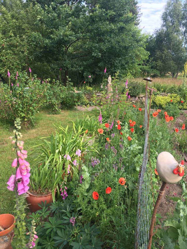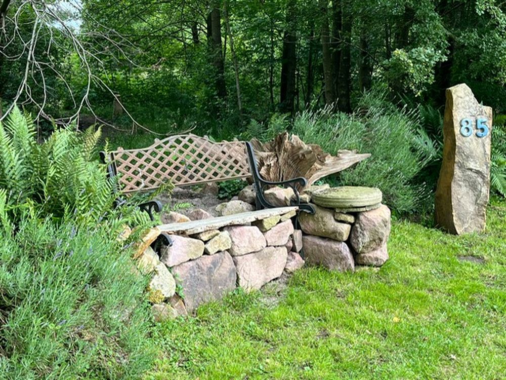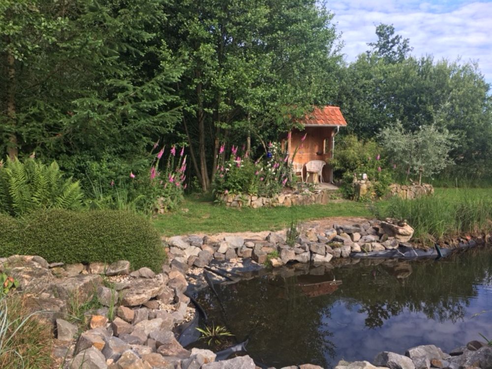 Waldgarten am Rande eines Landschaftsschutzgebietes mit vielen Eichenarten, Trockenmauern, Lichtung, zwei Teichen und Sitzgelegenheiten die zum Verweilen einladen, sowie einen Gemüsegarten und Hühnern.