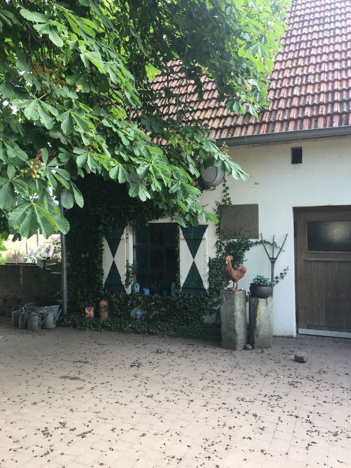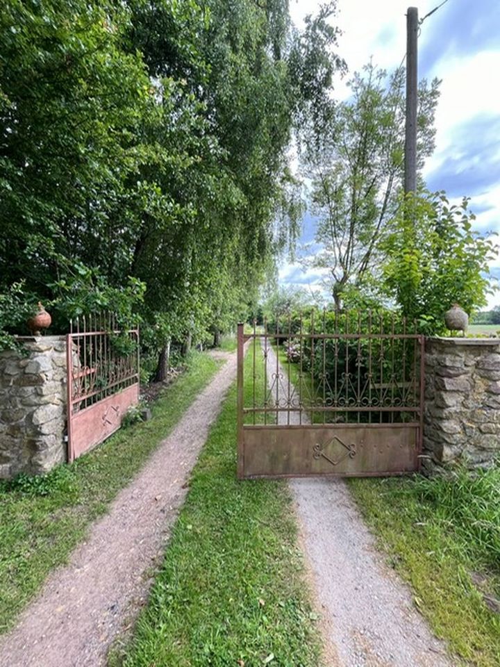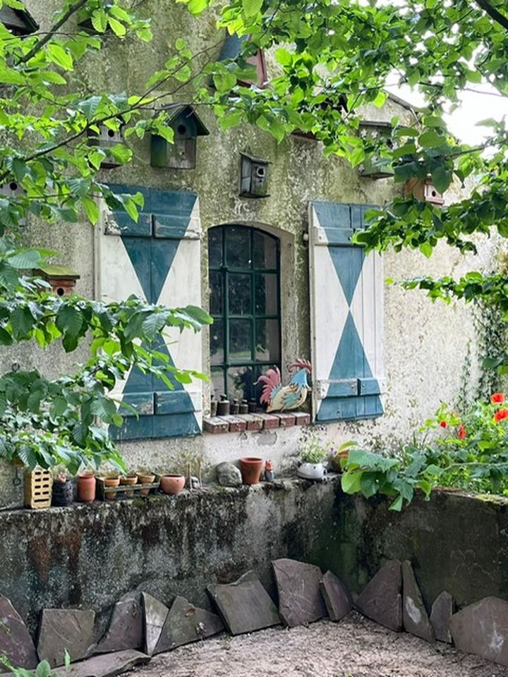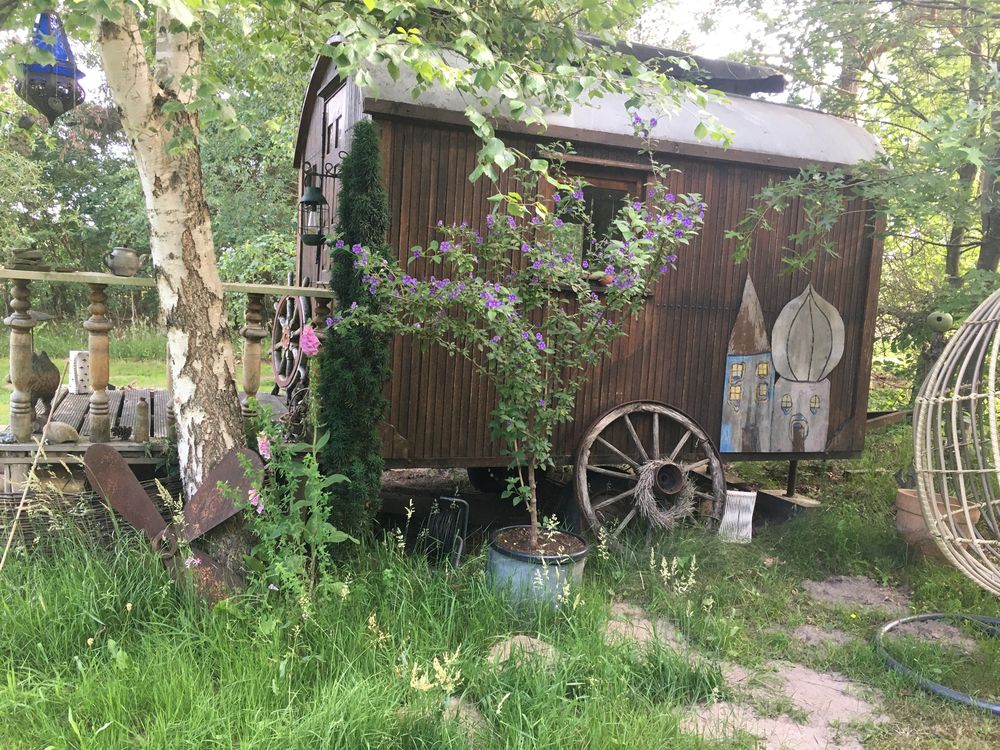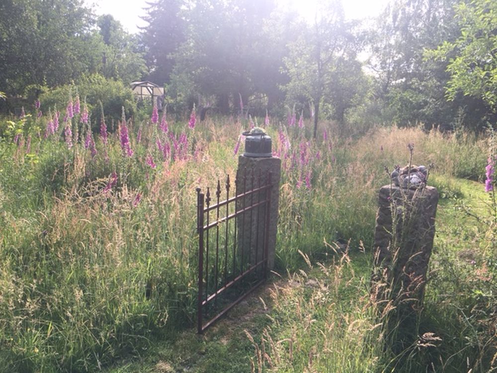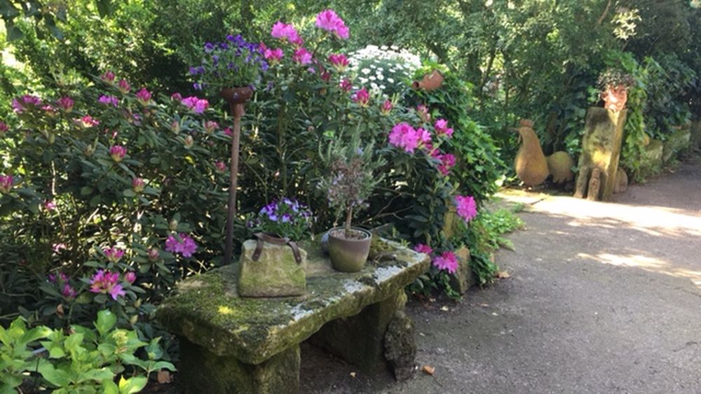 Waldgarten am Rande eines Landschaftsschutzgebietes mit vielen Eichenarten, Trockenmauern, Lichtung, zwei Teichen und Sitzgelegenheiten die zum Verweilen einladen, sowie einen Gemüsegarten und Hühnern.