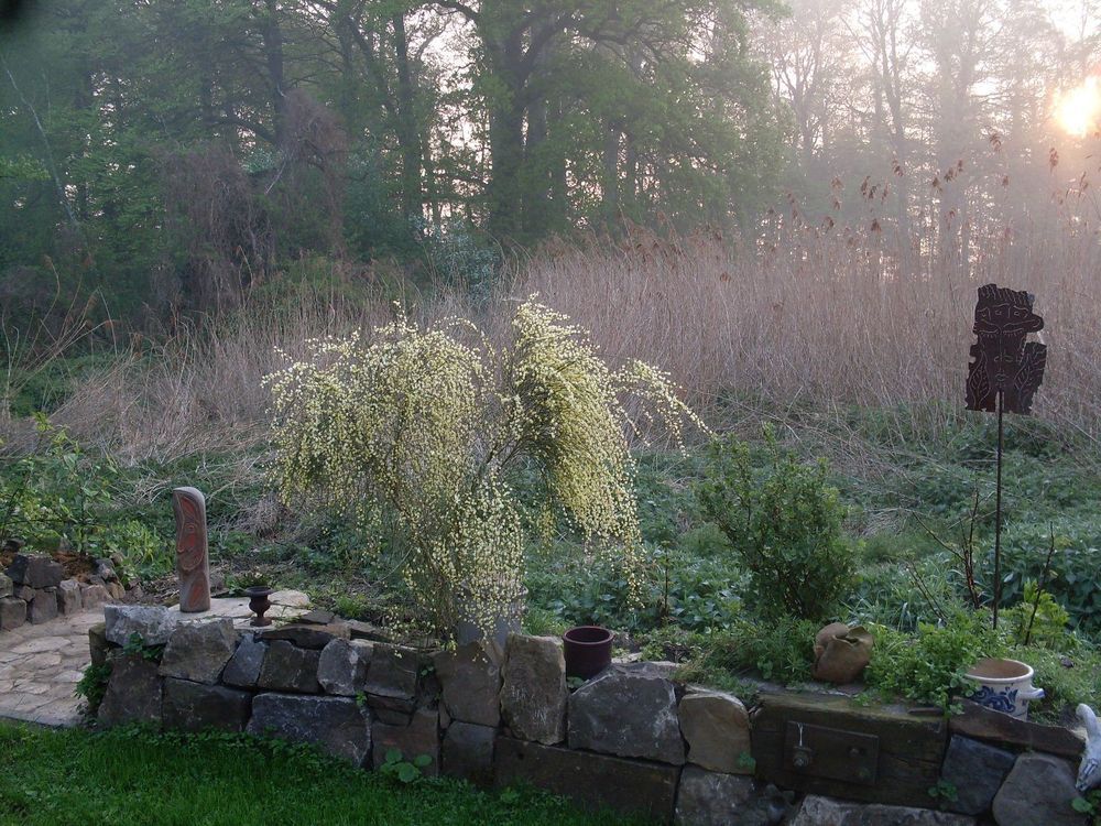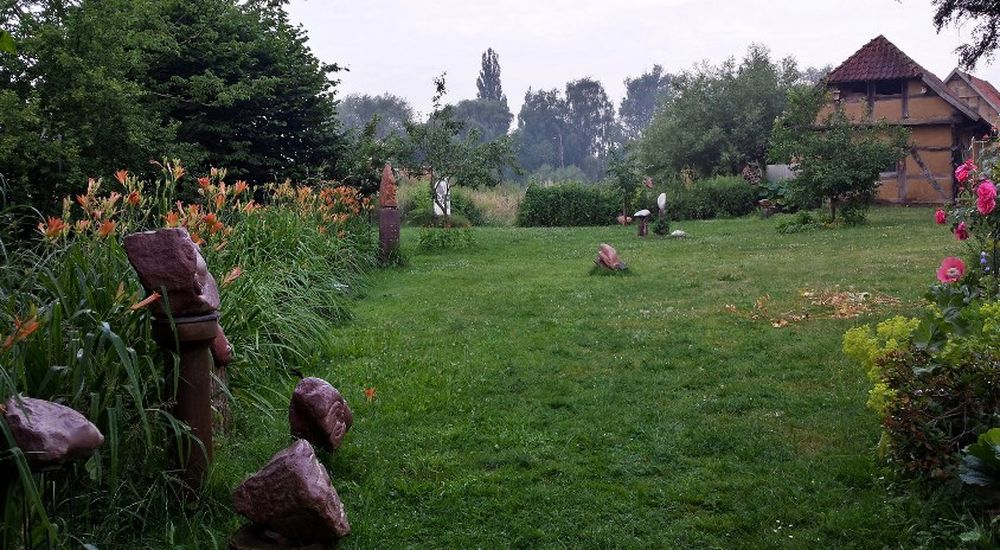 Seit 2012 verwandeln der Schauspieler Peter Badstübner und der Bildhauer und Maler Rolf Brüning das ehedem verwilderte Grundstück hinter dem „Atelier im Malgarten“ auf dem südlichen Klostergelände in einen reizvollen Standplatz für Brünings Plastiken und ein ansprechendes Umfeld für seine Bildhauerkurse. Keinen Garten zu erzwingen ist ihr Anliegen, sondern mit den Gegebenheiten vor Ort zu arbeiten. So entstand aus vorhandenen und vielen mitgebrachten Bäumen, Büschen und Stauden, eingerahmt von Gräfte, Teich und Schilf des angrenzenden Feuchtbiotops, ein Areal zwischen „kontrollierter Wildnis“ sowie Zier- und Nutzgarten, in dem Rose und Brennessel, Sumpfschwertlilie und Kürbis gleichberechtigt, doch voneinander abgegrenzt existieren und zu einem Ambiente beitragen, das den idealen Hintergrund für Brünings Plastiken bildet. Direkt neben dem Skulpturengarten befindet sich seit 2017 der von Peter Badstübner in Trockenmauerweise erbaute Steinkreis aus historischem Sandstein – ein idealer Veranstaltungs- und Versammlungsort, an dem man jedoch auch alleine und ganz in Ruhe die Seele baumeln lassen kann. Ein Besuch hier lässt sich nach Absprache mit einer kreativen Tätigkeit im Innen- oder Außenbereich wie Bildhauern, Malen oder Plastizieren bei Rolf Brüning oder Erlebnis Sprechen bei Peter Badstübner kombinieren.