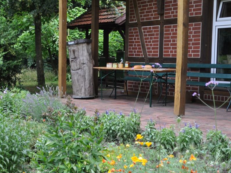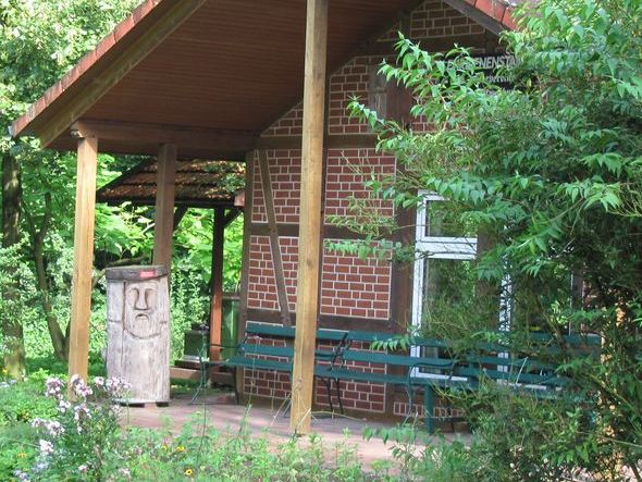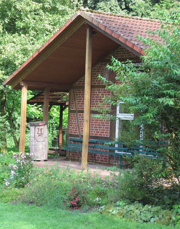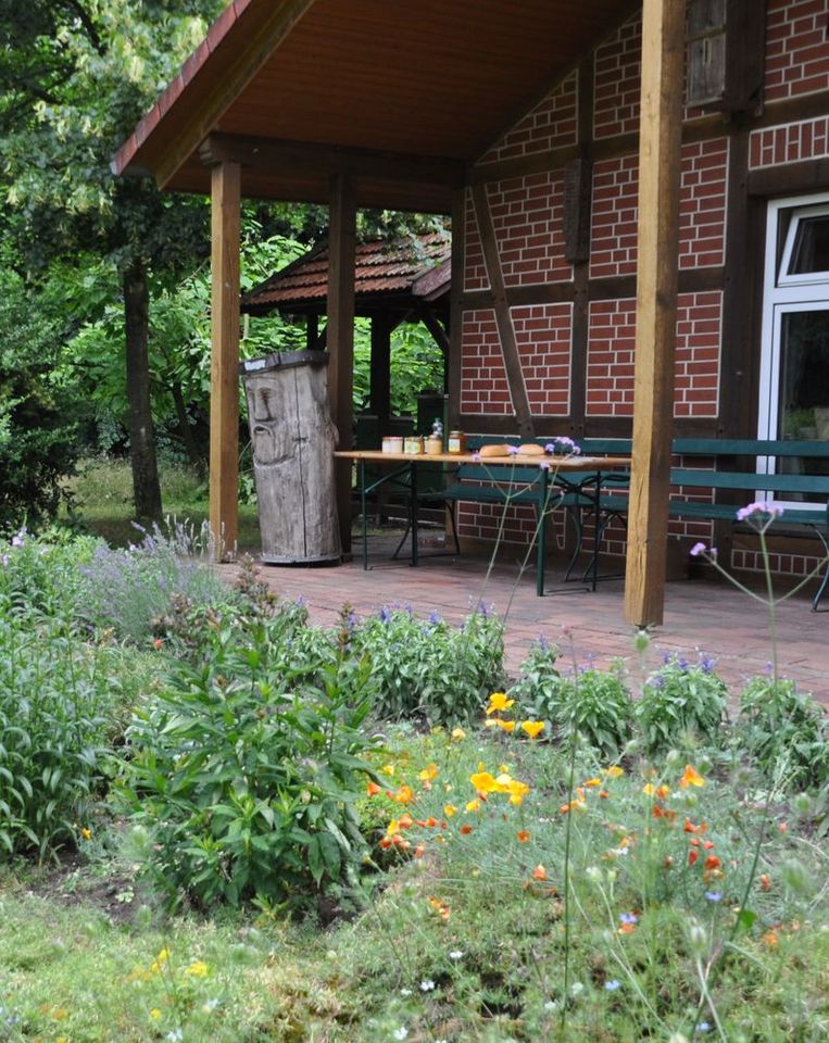 Wir haben einen idyllisch auf einer Lichtung im Wald gelegenen "bienenfreundlich" gestalteten Garten mit Euodia (Bienenbaum), großem Wildbienenhotel, mehreren Bienenvölkern sowie einem Schaukasten mit einem Miniatur-Bienenvolk.