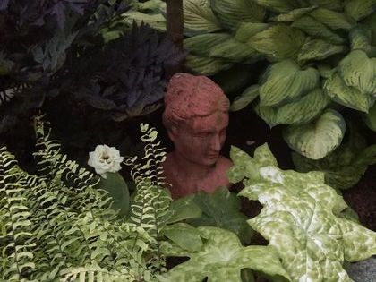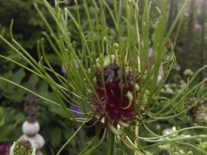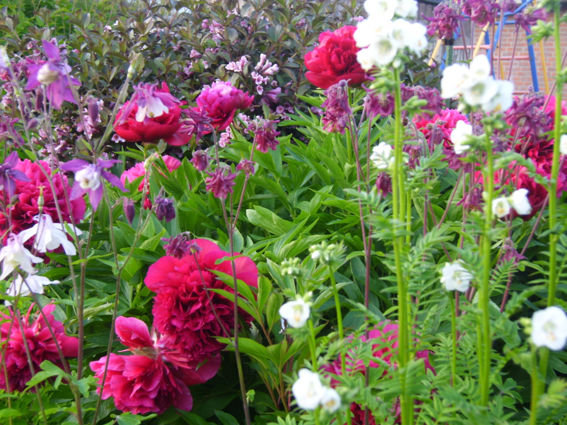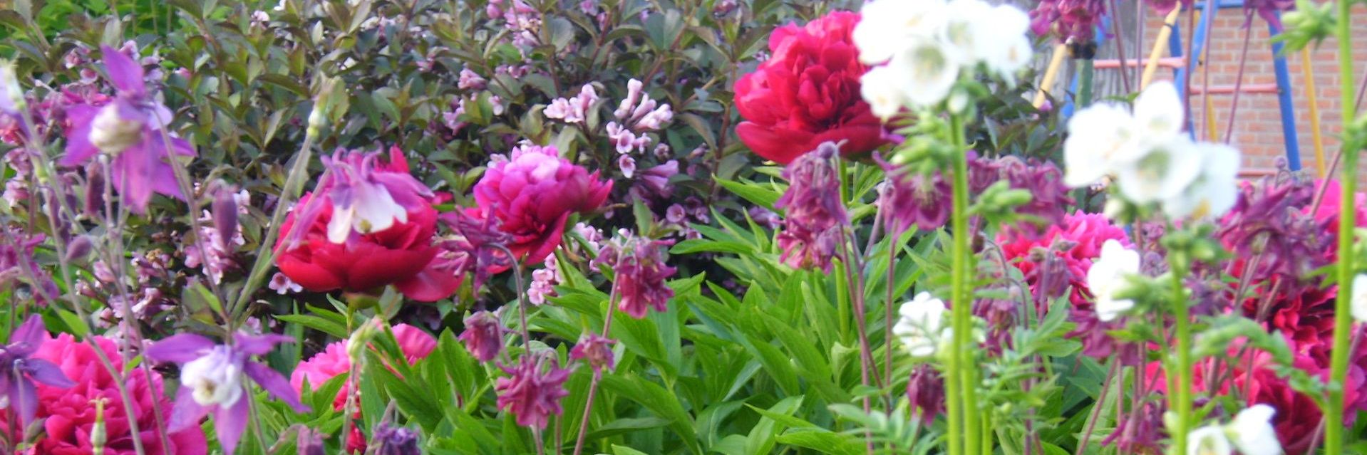 Von einer Blutbuchenhecke gesäumter Garten mit vielen gemütlichen Sitzecken. Kletter- und Rambler- sowie historische und moderne Rosen, Hosta und seltene Stauden blühen neben Gewürzsträuchern und Obstgehölzen. Hochbeete ersetzen den Gemüsegarten.