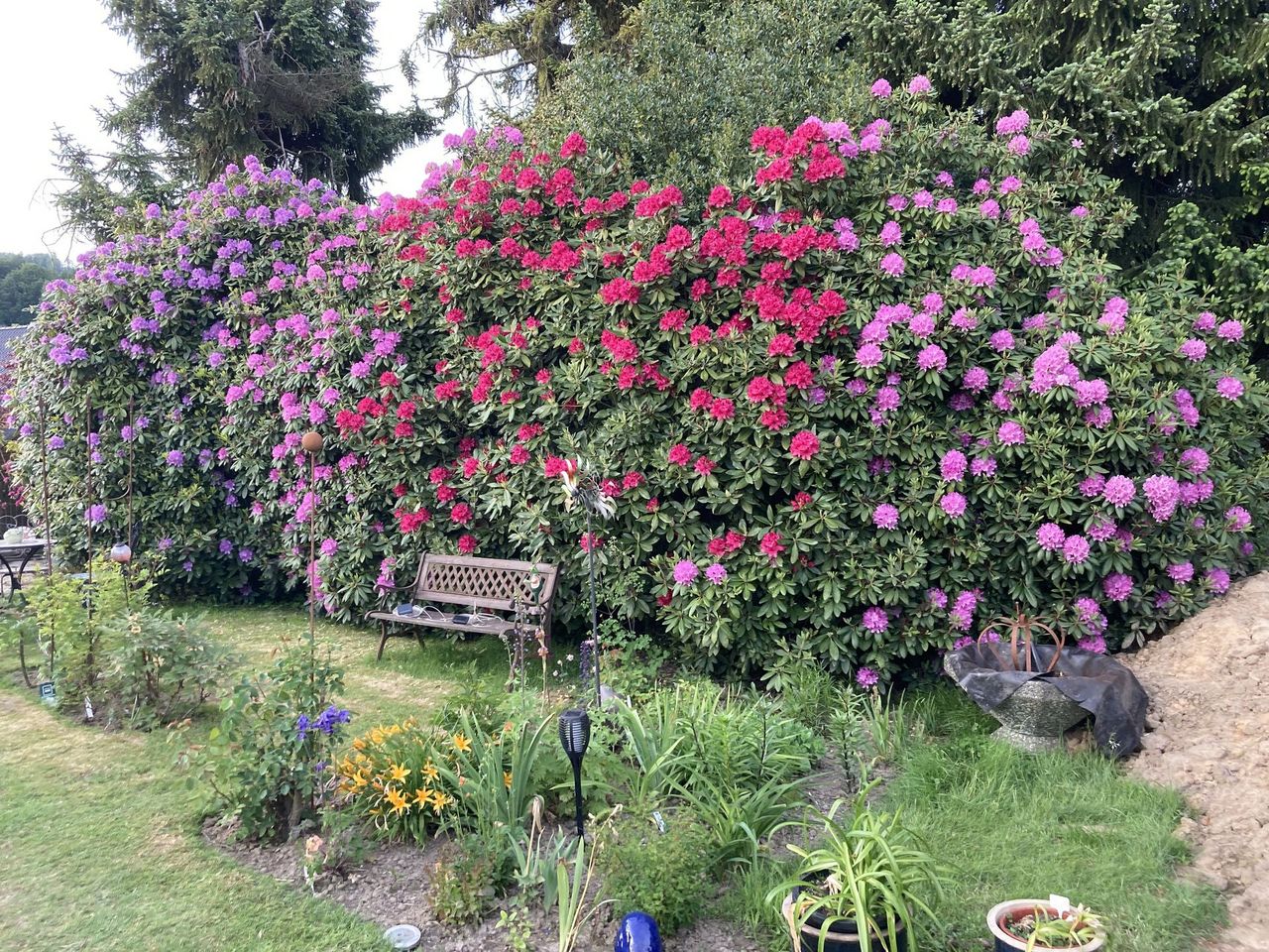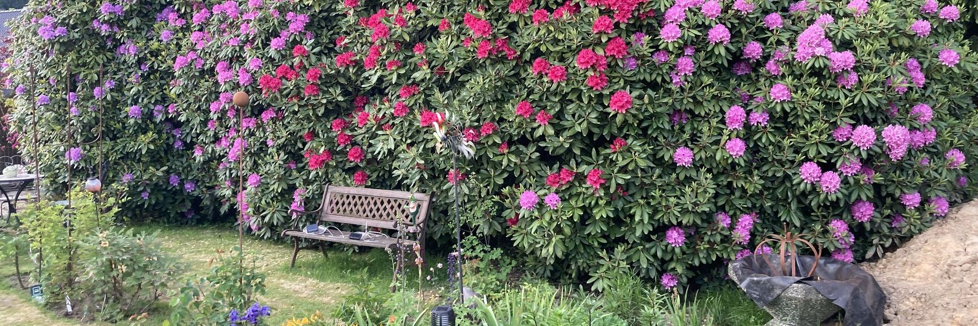 Naturgarten mit vielen Gartenräumen auf 1590 m², Schwerpunkt englische Rosen. Sitzecken laden zum Verweilen ein. Taglilien, Pfingst- und Baumpäoniensammlung, Präriegarten, Teich mit Wasserfall, Gemüsehochbeete, Staudenraritäten von A - Z, Laufenten und vieles mehr.